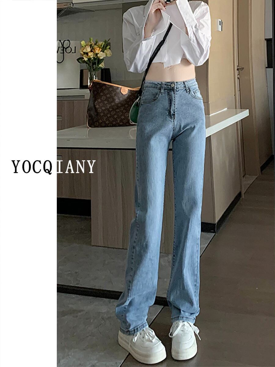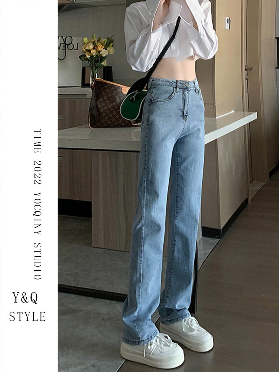 ライトカラーストレートレッグパンツデニムレディースハイウエストサマースタイル2022初秋の細くて長いトールモップパンツシガレットパイプパンツ ハイウェスト ロング レッド 夏物 オータム 秋物 youqi85361691598
