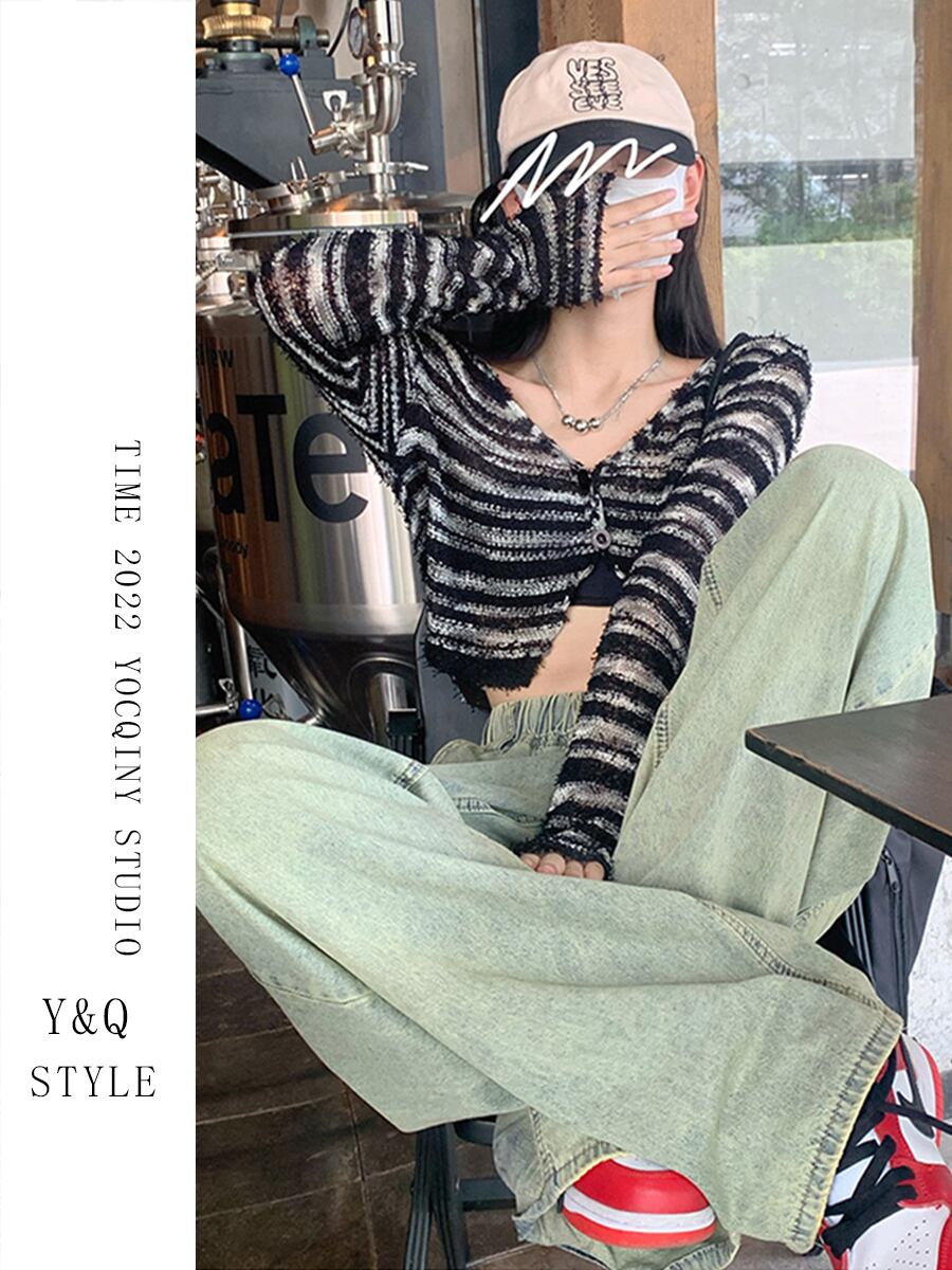 レトログリーンアメリカンワイドレッグジーンズレディースドローストリングハイウエスト2022年秋新作スリムたるみモップパンツ オータム 秋物 youqi40532818307