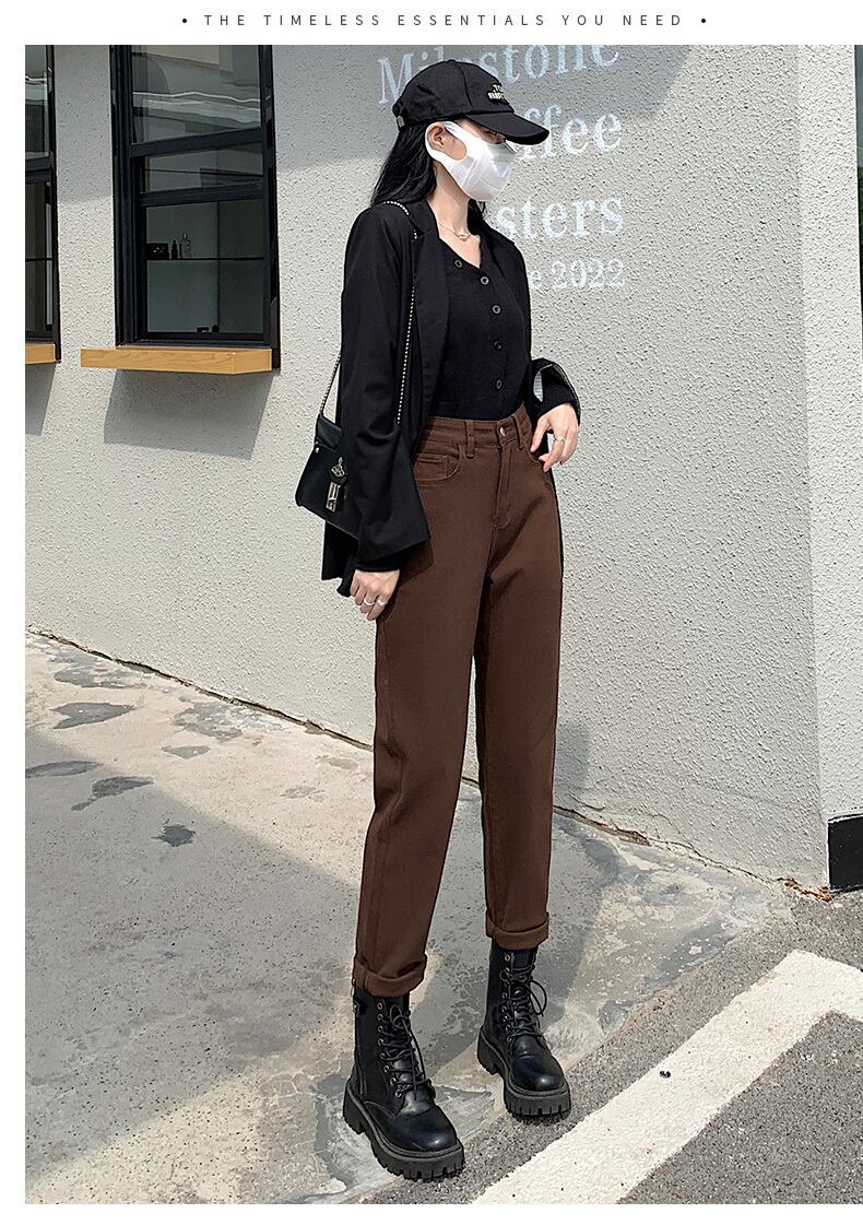 2022 新スタイルブラウンストレッチハーレムパンツハイウエストジーンズ子供春と秋ストレートルーズパパパンツは薄い ハイウェスト スプリング 春物 オータム 秋物 youqi3277471381