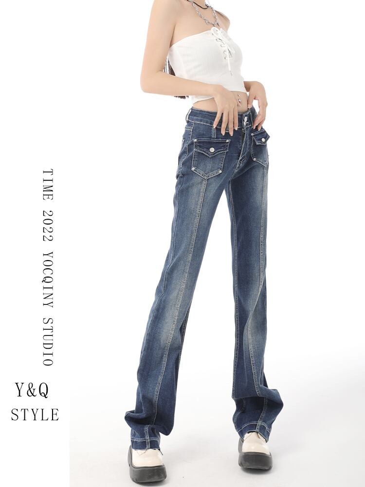 アメリカン レトロ ブルー ニッチなデザイン感 マイクロラグ ストレッチ ジーンズ レディース ダブルボタン スリムフィット スリムホーン 潮干し youqi79926224259