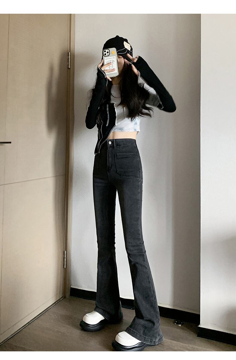 スモーク グレー ジーンズ女性のマイクロ ホーン ハイウエスト 2022 年秋新しいスリム シックな弾性スリム フィット モップ パンツ エラスティック 伸縮 オータム 秋物 youqi28149157629