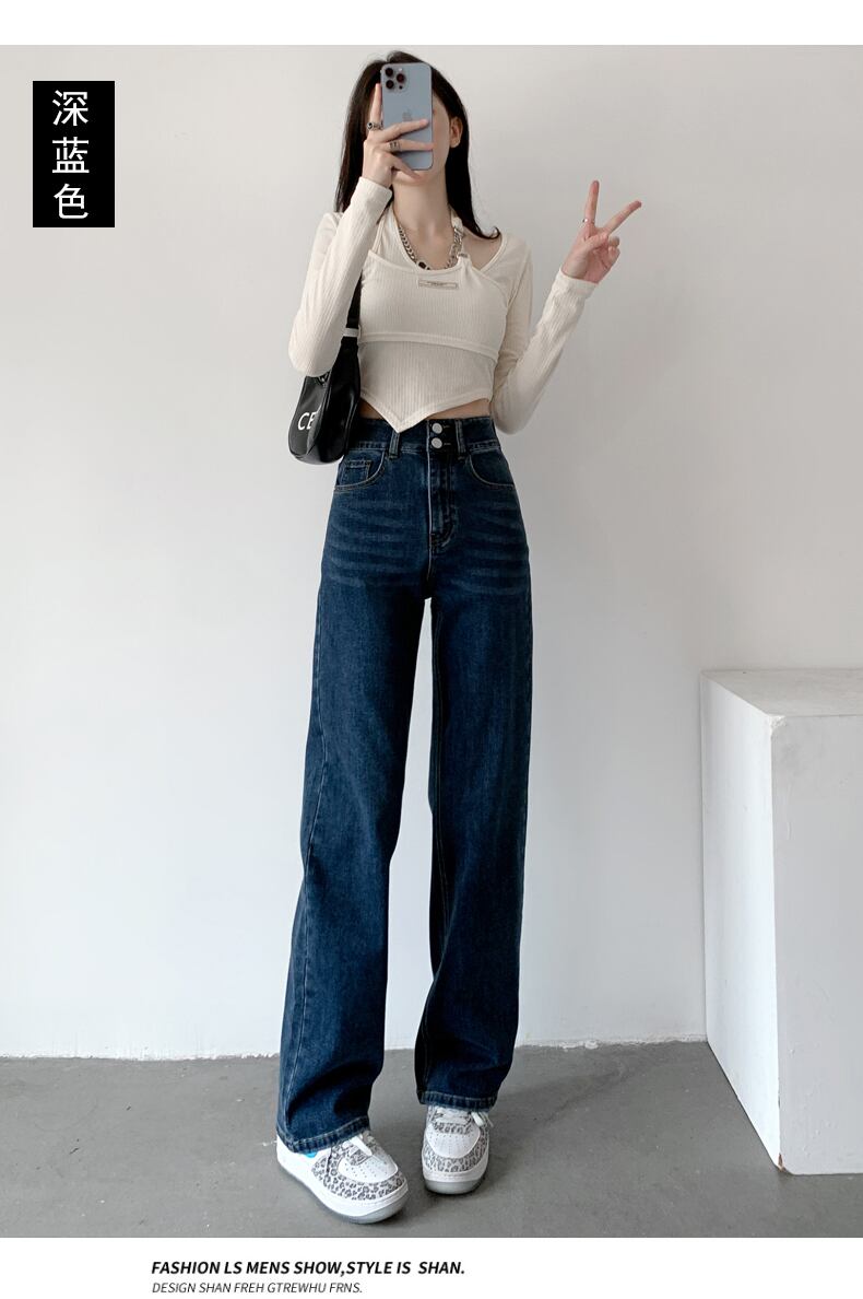 ストリート スタイルのマルチ ボタン露出ウエスト ジーンズ女性のルーズで薄いレトロ ブルー ストレート パンツ ドレープ ハイ ウエスト床を拭く ハイウェスト youqi45031541445