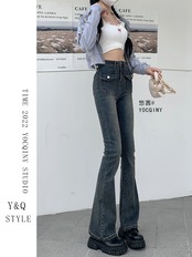 2022 秋の新レトロブルーマイクロフレアパンツストレッチハイウエストジーンズ女性のデザインセンスパンツは細くて背が高い ハイウェスト レッド オータム 秋物 youqi91160898268