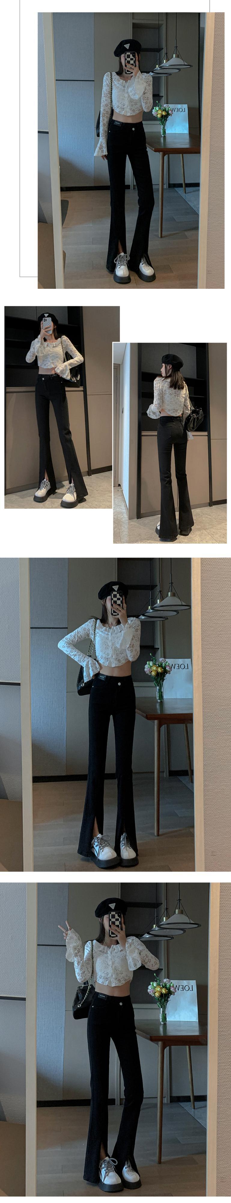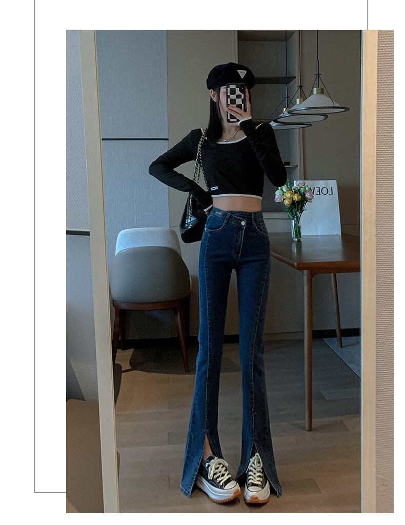 スタイルの斜めバックル スリット デザイン ニッチ フレア パンツ スリム フィット マイクロブレード オールマッチ ジーンズ 女性のチベットの肉は薄くて不規則です レッド youqi50240701369