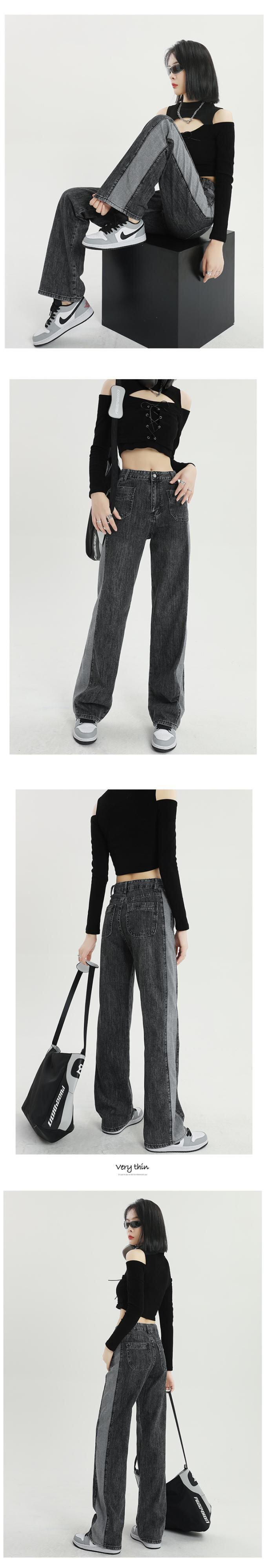 ハイウエスト 2 色ステッチ スリム ワイドレッグ パンツのバージョンの女性スリム ストレート ブラック グレー ジーンズ オールマッチ シックなトレンド ハイウェスト youqi53078714453