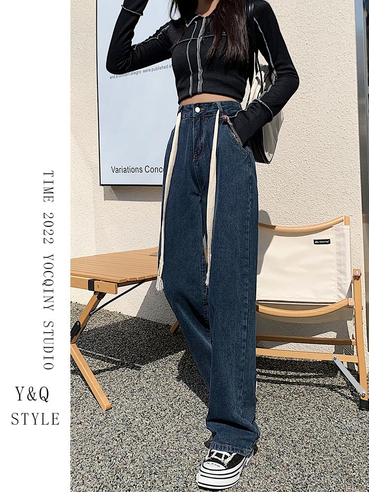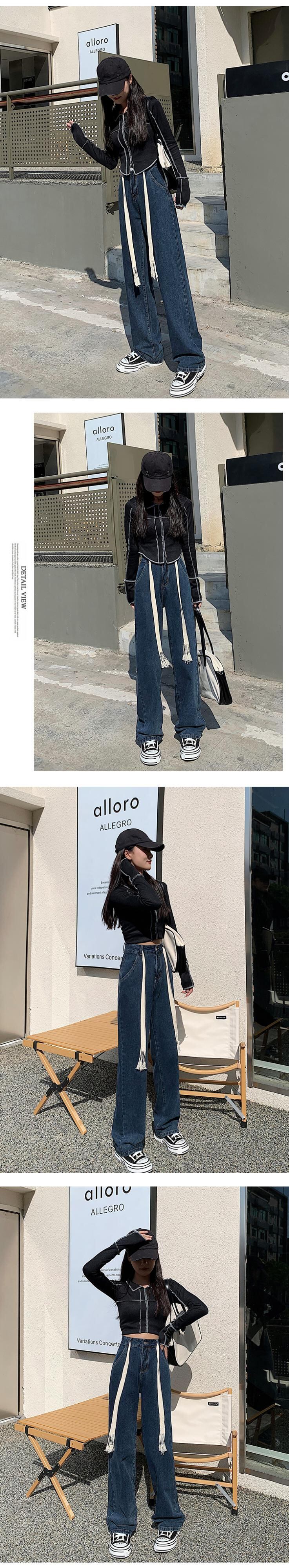 ブルーグレー ハイウエスト ジーンズ レディース ドローストリング カジュアル ストレート ルーズ ドレープ ワイドレッグ パンツ 薄くて小さい 床を拭く youqi86856689104