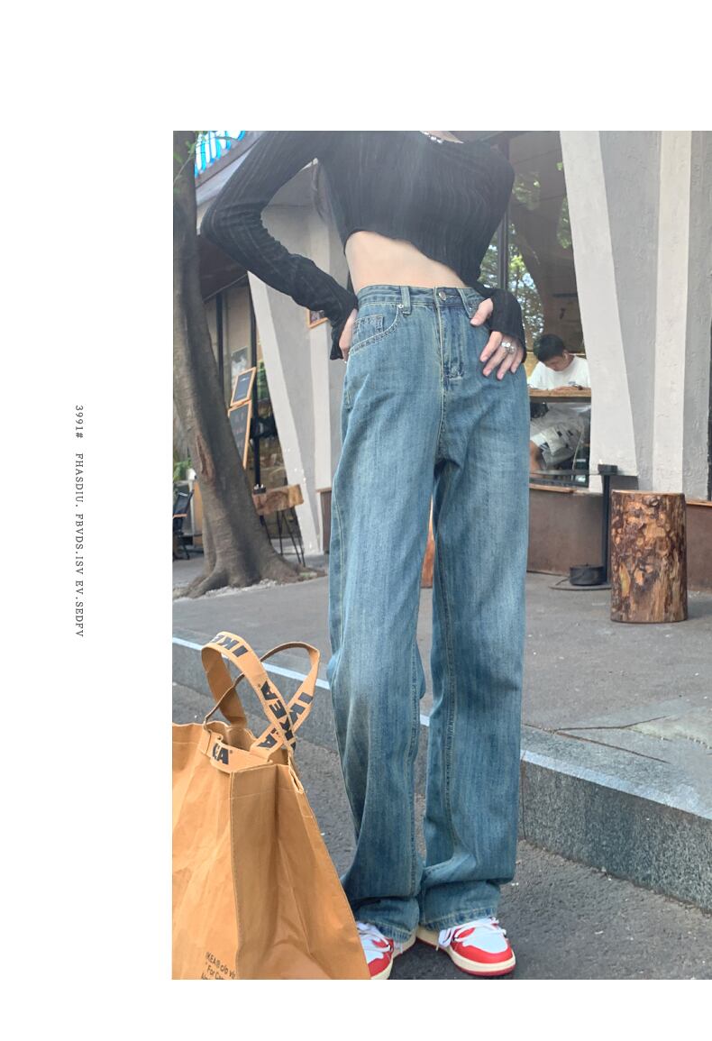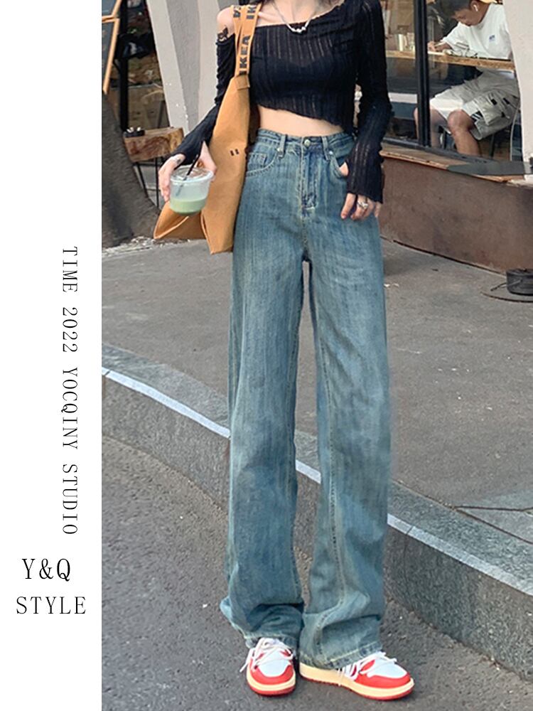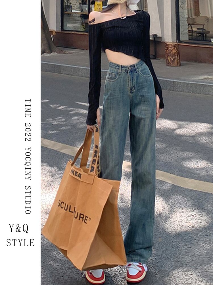 アメリカン レトロ ハイウエスト ワイドレッグ ジーンズ レディース 秋の新作 ルーズ ストレートレッグ パンツ ウォッシュ加工 細くて背の高い レッド オータム 秋物 youqi82765949160
