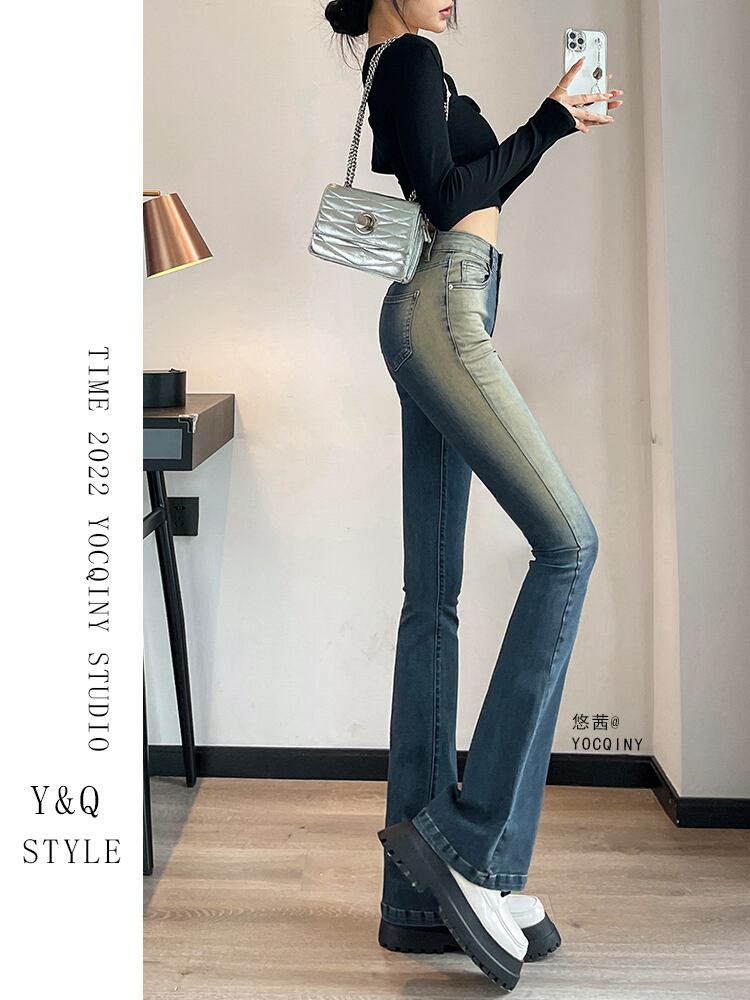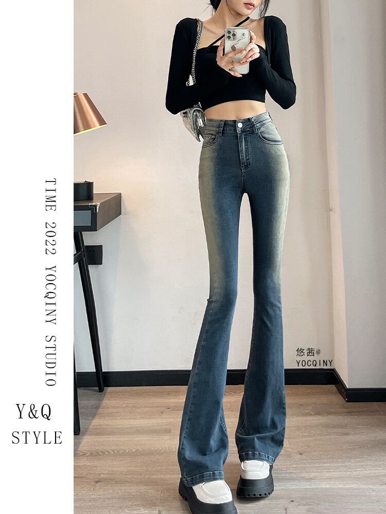 ストリート ノスタルジック ブルー グラデーション ハイウエスト フレア ジーンズ レディース 2022年秋の新作スタイルは薄手で床拭き レッド オータム 秋物 youqi20894917905