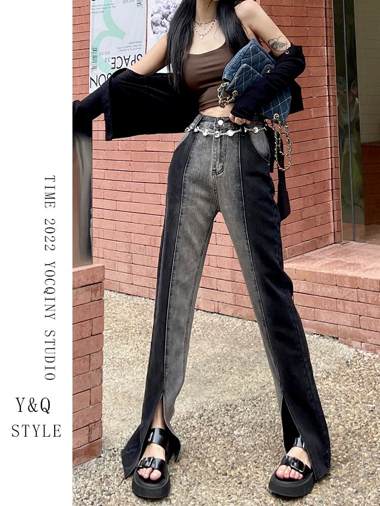 アメリカン スプリット ストレート パンツ ルーズ ハイウエスト ジーンズ レディース 2022年 秋着 新作 痩身&年齢引きオールマッチ ハイウェスト オータム 秋物 youqi96436126470