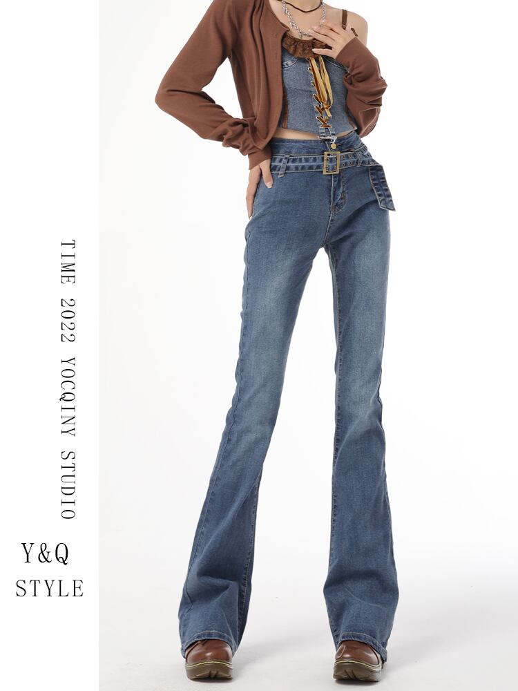ストリート 2022 秋モデル オン レトロ ブルー オールド ベルト デザイン フレア パンツ スリム ハイウエスト ジーンズ レディース スリムフィット ハイウェスト レッド オータム 秋物 ハーネス youqi14162082127
