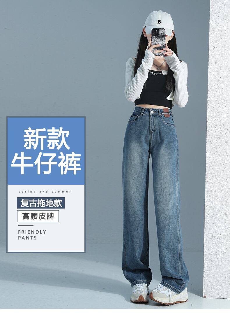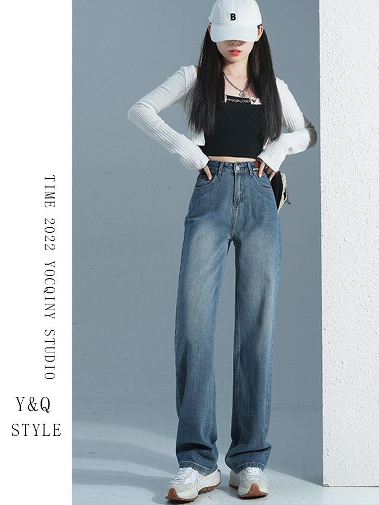 2022秋の新作レトロブルーハイウエストジーンズ女性の夏のシンプルなワイドレッグパンツは薄くてモップロングパンツ9点 サマー 夏物 オータム 秋物 youqi98576854853