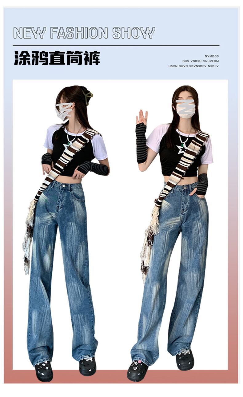 欧米のストリートスタイル グラフィティ ハイウエスト ストレート ジーンズ レディース デザインセンス ニッチ ハイストリート 秋 薄手 断面 ドレープ 薄手 ハイウェスト オータム 秋物 ヨーロピアン youqi78106907540