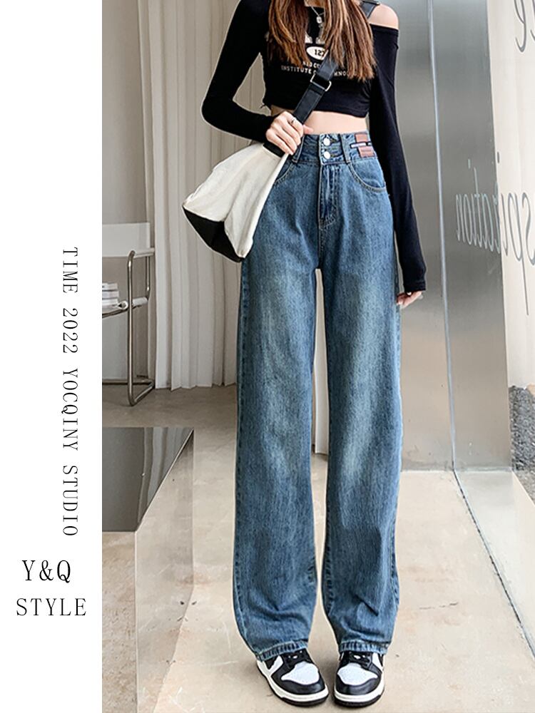 今年の人気スタイル2022レトロブルーストレートジーンズ女性の垂れ下がったハイウエストの薄いワイドレッグパンツは薄くて床を拭いています youqi36129132558