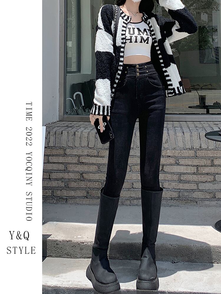 インタイド弾性スリムフィットペンシルパンツハイウエストジーンズの黒バージョン女性の秋のペンシルパンツは薄くて背が高い ブラック エラスティック 伸縮 オータム 秋物 youqi11134387518