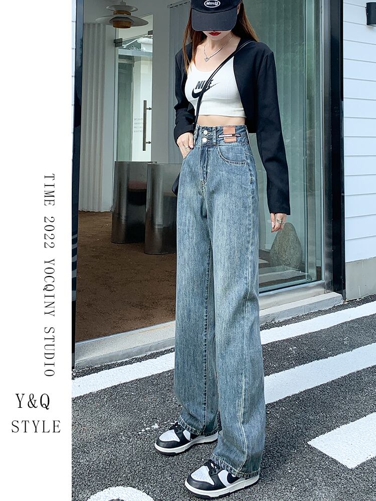 - 2022年の新しいダブルボタンデザインの女性用ウエストワイドレッグジーンズ youqi11856269906
