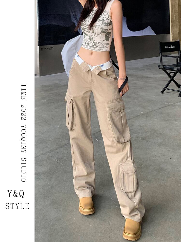 アメリカンフランジングデザインラージポケットカーキオーバーオールカジュアルワイドレッグジーンズ女性 2022 初秋の新 オータム 秋物 ワイドパンツ youqi55395021724
