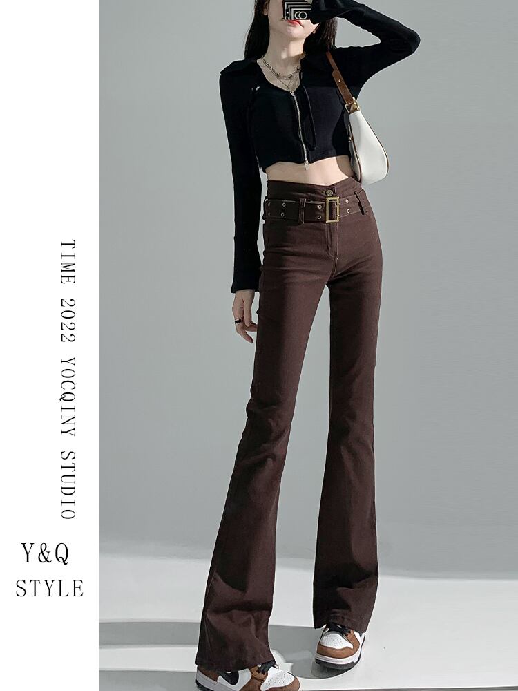 秋の初めに、新しいニッチな赤茶色のマイクロラグハイウエストのタイトな伸縮性のある薄いジーンズの女性が床を拭くフレアズボンの潮 レッド エラスティック オータム 秋物 youqi45141488639