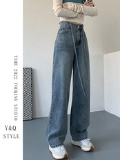 ニッチなデザインセンスタイドロープワイドレッグハイウエストストレートレッグジーンズ女性の2022年秋の新しいルーズモップパンツは薄く見えます オータム 秋物 youqi77870557422