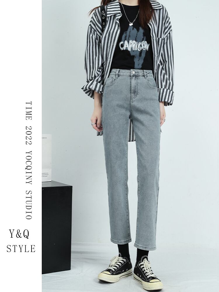 小さな男は2022年秋ライトブルーハイウエストストレートジーンズ女性のスリムな9点弾性タバコパイプパンツLサイズを着ています ハイウェスト エラスティック 伸縮 大きめサイズ オータム 秋物 youqi97460197052
