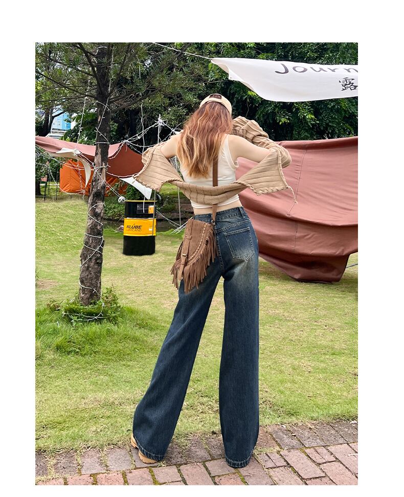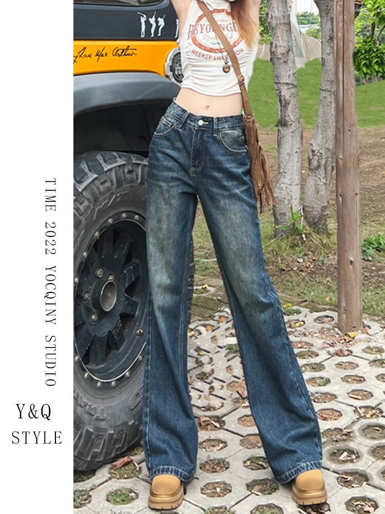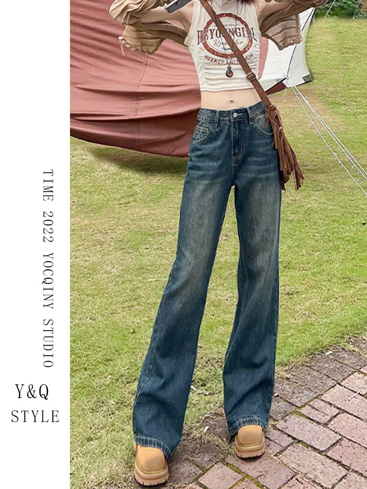 アメリカンハイストリートバイブフレアパンツレディースハイウエストゆったり薄手秋洗いレトロデニムモップパンツ ハイウェスト レッド オータム 秋物 youqi42704753789