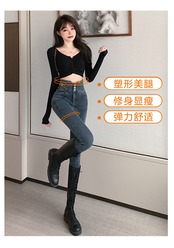 背が高くて薄い超ハイウエストジーンズの女性の春と秋の青灰色のタイトなペンシルパンツスリムな小さな足の伸縮性のあるデザインセンス ブルー エラスティック スプリング 春物 オータム 秋物 youqi75114191390