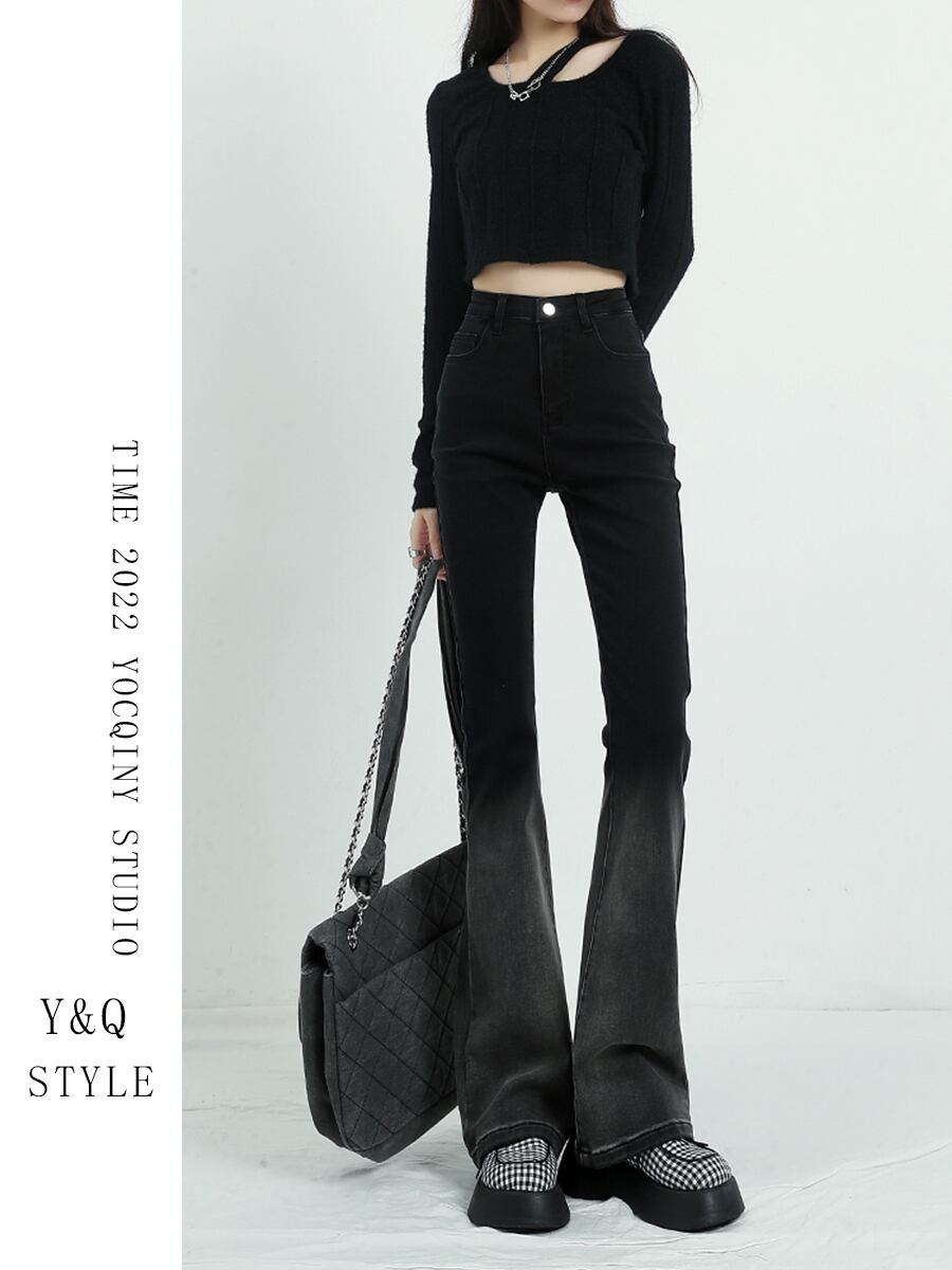 グラディエントブラックマイクロフレアジーンズ女性用ハイウエストスリムフィット2022年春と秋の新しいスタイルの馬蹄形のズボンは床を拭く スプリング 春物 オータム 秋物 youqi85130822022