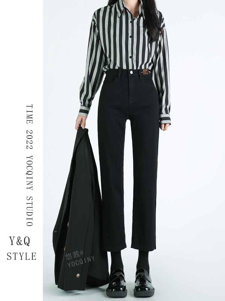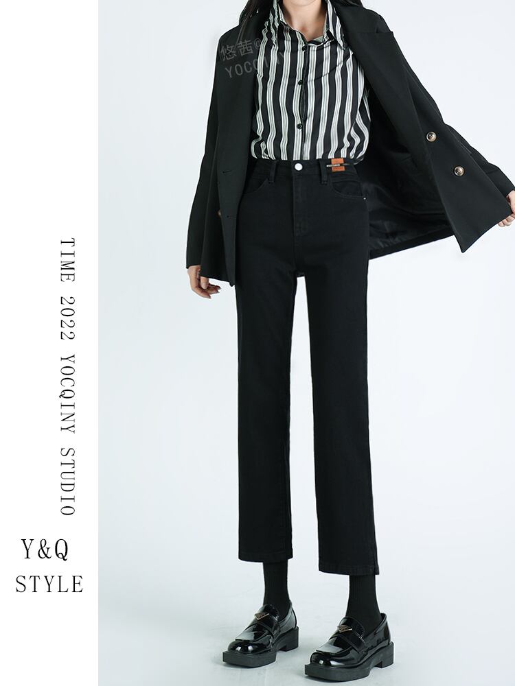 黒シガレットパンツ女性の 2022 年の新しい秋のスタイルの薄いハイウエストジーンズわずかにスリット 8 点 9 点ペンシルパンツ ブラック オータム 秋物 youqi34973287219