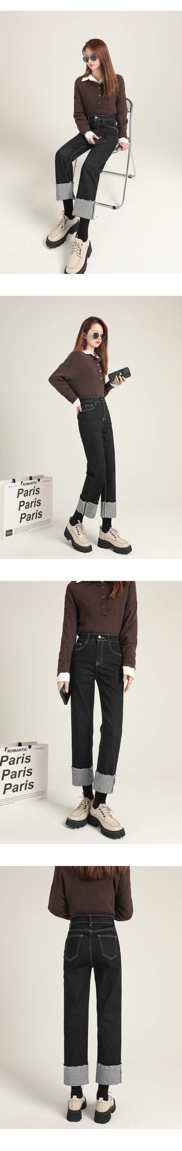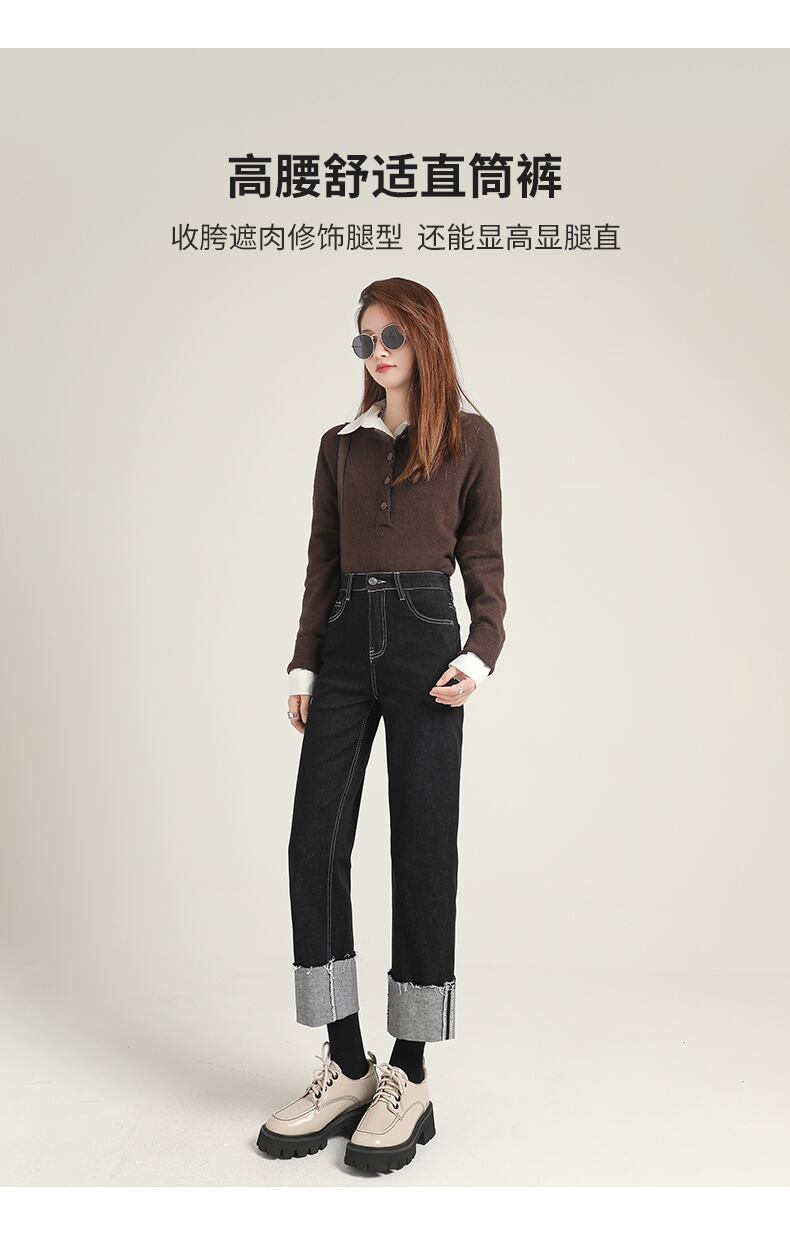 秋と冬の新しい九点ストレート ハイウエスト ジーンズ フランジ デザイン感の自己修養弾性女性の鉛筆シガレット パンツ トレンド エラスティック 伸縮 オータム 秋物 ウィンター 冬物 youqi93907490601