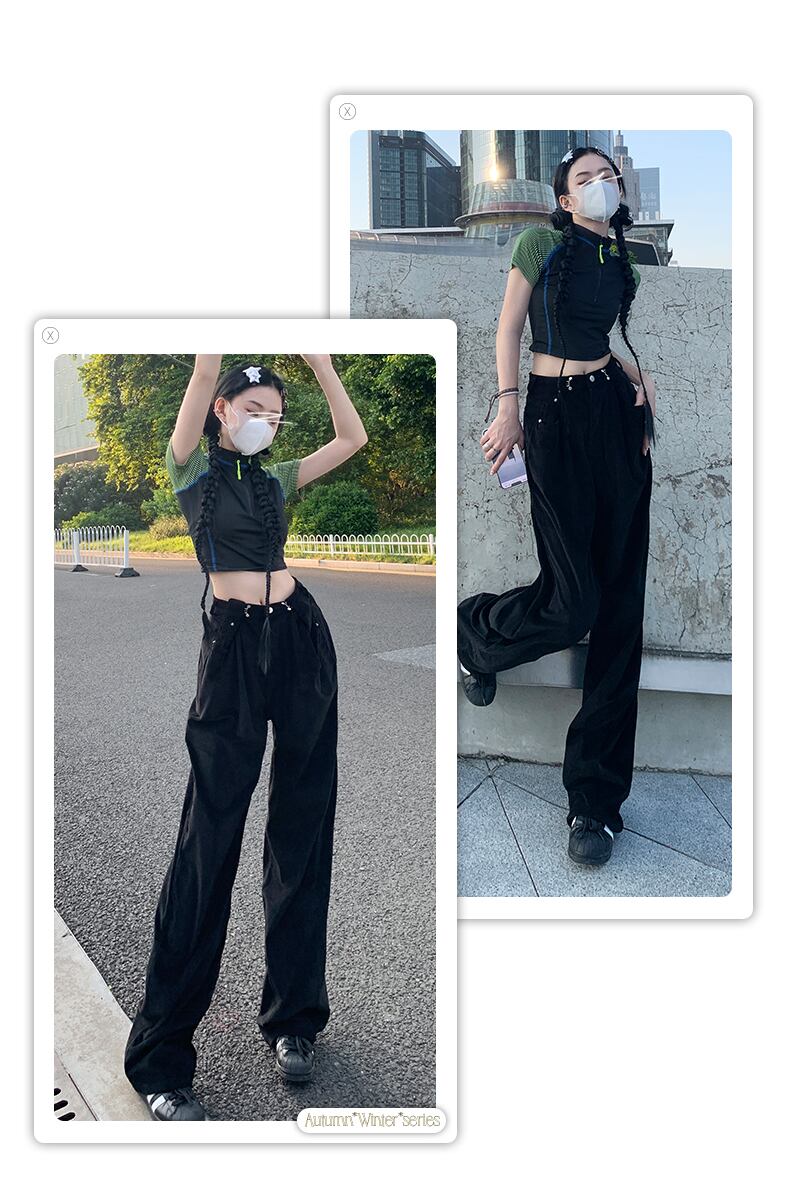 秋と冬の新しいコーデュロイ黒のワイドレッグ カジュアル パンツ調節可能なウエストのゆったりとした薄いニッチ イン タイド ハイ v ブラック オータム 秋物 ウィンター 冬物 アジャスタブル youqi19912840194