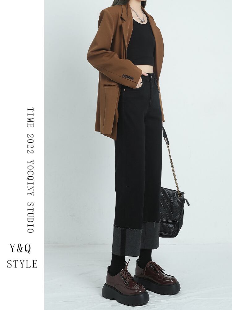 黒ドレープ ワイドレッグ パンツ ハイウエスト ジーンズ女性の秋と冬の新しい擦り切れた外反母趾ニッチ デザイン新しい痩身 ブラック オータム 秋物 ウィンター 冬物 youqi76210114414