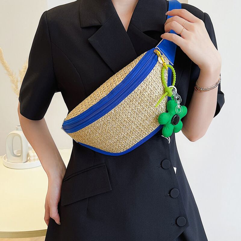 わら織りバッグレディースバッグ新しいスタイルファッションワイドショルダーベルトウエストバッグチェストバッグ小さな新鮮なコントラストカラーシングルショルダーメッセンジャーバッグ ハーネス maibag80686681488