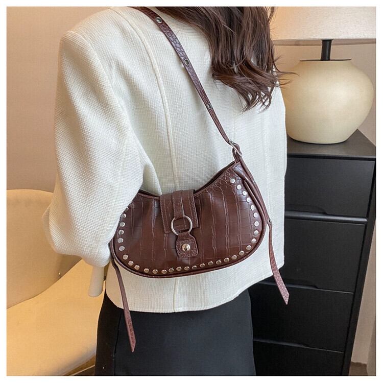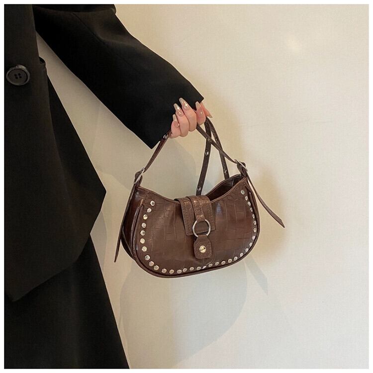 2023 新しいトレンディなレトロリベットオートバイバッグ三日月バッグサドルバッグ折り目オールマッチシングルショルダーメッセンジャー脇の下バッグ女性 シートバッグ maibag85995426392