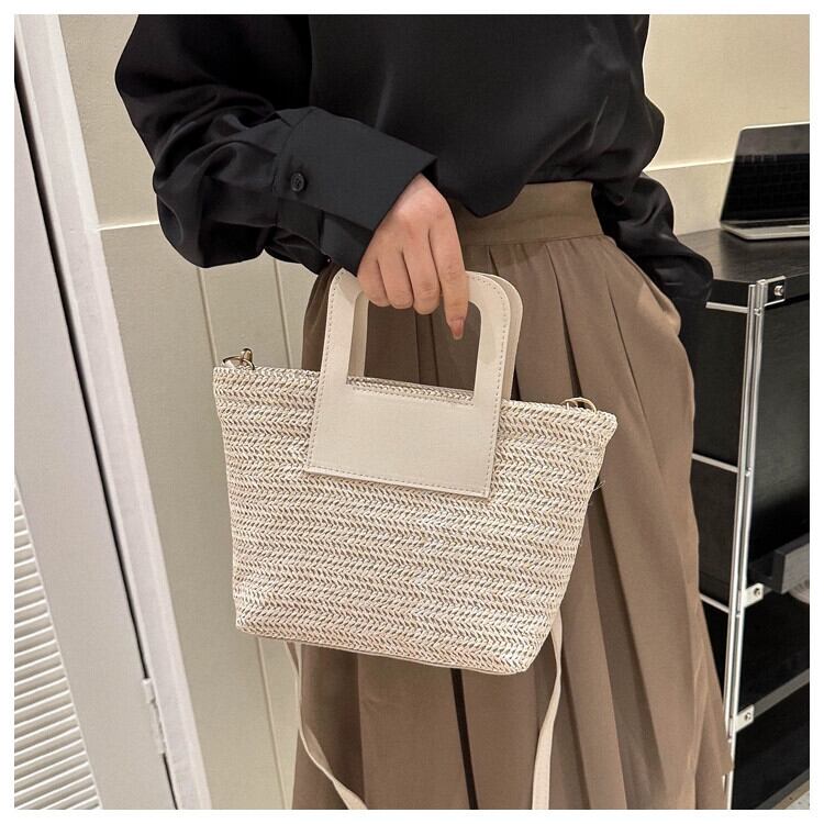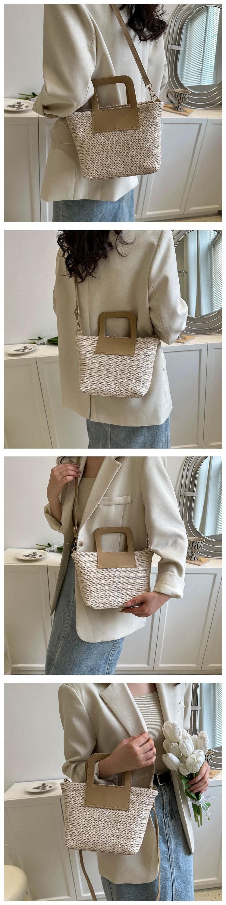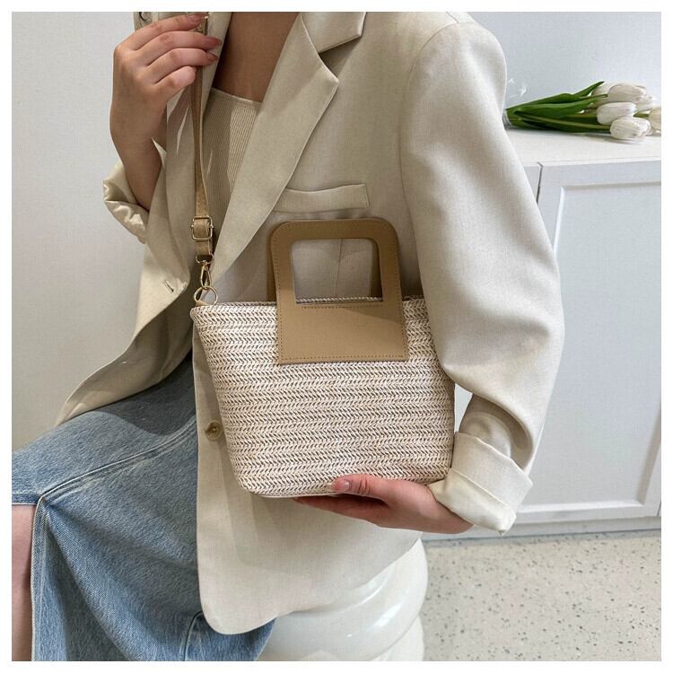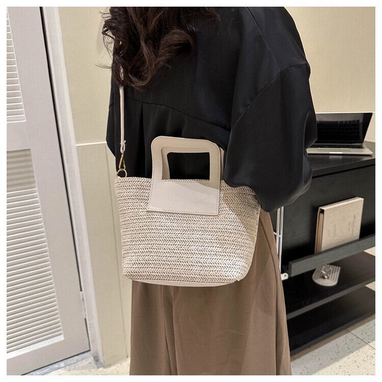 わら織りバッグの女性の大容量 2023 新しいトレンディな休暇ビーチわらバッグ織りレトロカラーコントラスト通勤バケツバッグ ストローバッグ maibag8941212959