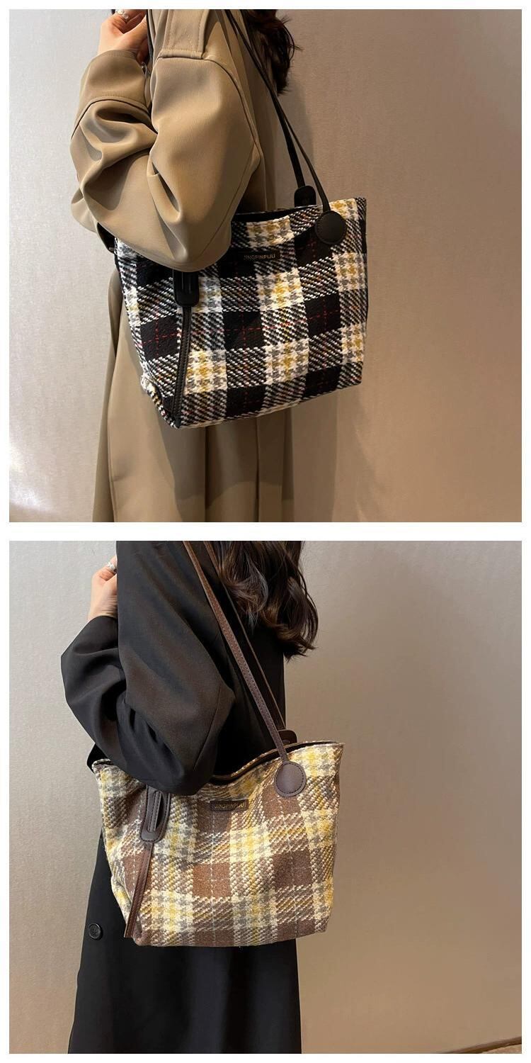 ニッチデザインバッグ女性 2022 新スタイルトレンディなチェック柄ウールハンドバッグ大容量通勤ショルダートートバッグ maibag2035424898