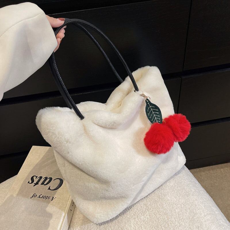 -2021冬新作バッグ大容量多用途ファッショナブルなポータブルバケットバッグチェリーぬいぐるみベルベットサッチェル ウィンター 冬物 maibag131345886