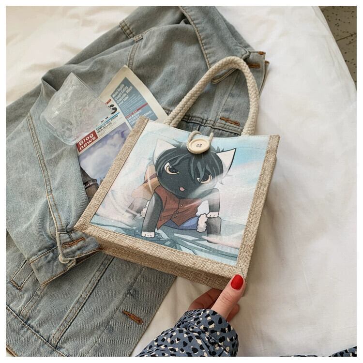 黒豆ニャーランチボックスランチバッグ 2021 キャンバスバッグ女性のハンドバッグインセ漫画学生 Cl バッグトレンディ ブラック maibag33304640078