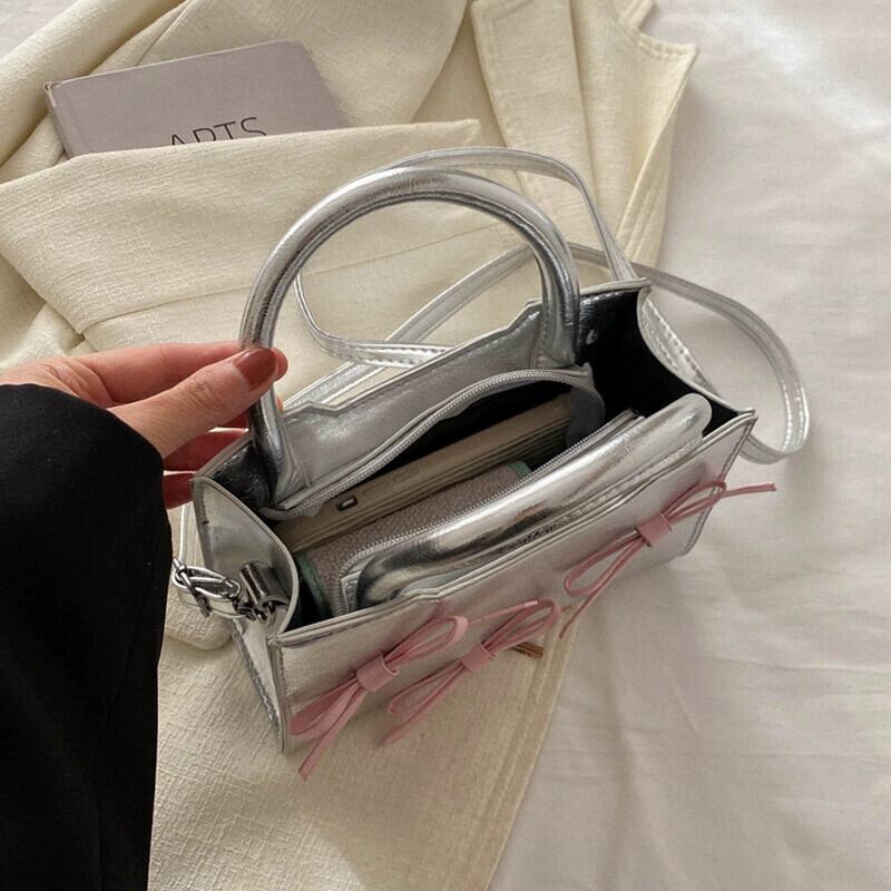 シルバーリボンハンドバッグ女性 2024 春かわいい小さなスクエアバッグ多用途ショルダークロスボディバッグ 大人ガーリー スウィート キュート カジュアル スプリング 春物 銀 スクウェア maibag23243309368