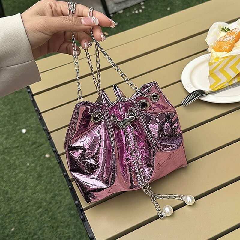 -エンドテクスチャードスモールバッグレディース2023新しいトレンディなニッチクロコダイルパターンチェーンショルダークロスボディバッグパールバケットバッグ レッド 真珠 maibag52779405452